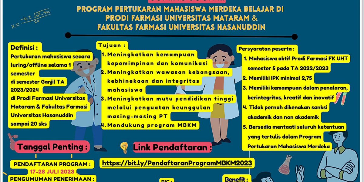 Kamis 20 Juli 2023 telah dilaksanan penarikan mahasiswa dari kegiatan pertukaran mahasiswa Universitas Mataram dari Prodi Farmasi FK UHT. Kegiatan dihadiri oleh kaprodi Farmasi Unram (Dr. apt. Agriana Rosmalina Hidayati, S.Farm., M.Farm, Kaprodi Farmasi FK UHT Surabaya, beserta bapak & ibu dosen Farmasi FK UHT Surabaya. Dengan adanya kegiatan ini diharapkan Mahasiswa mendapat pengalaman akademik maupun non akademik selama di […]