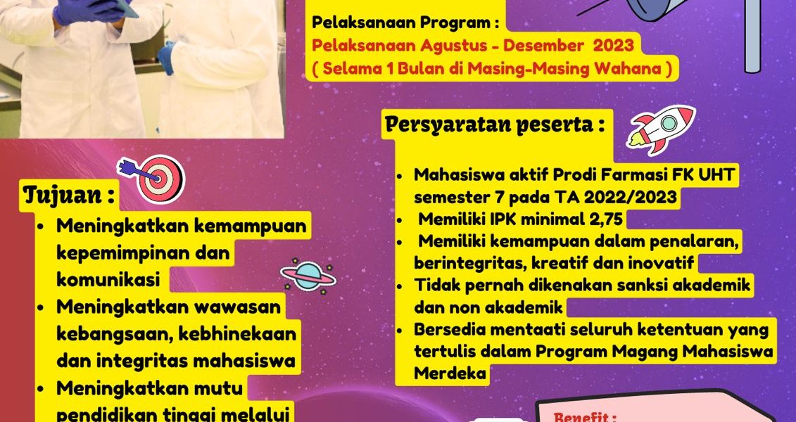 Read MoreProdi Farmasi UHT Surabaya membuka “Program Magang Mahasiswa Merdeka Semester 7” dalam rangka implementasi hibah implementasi hibah PPKM 2023. Program magang ini dirancang untuk mahasiswa prodi Farmasi UHT yang sedang berada disemester 7. Nantinya mahasiwa ini akan magang diempat wahana, yakni di Apotek, Puskesmas, Rumah Sakit, dan Industri Farmasi. Sejauh ini Prodi Farmasi sudah bekerja sama dengan […]