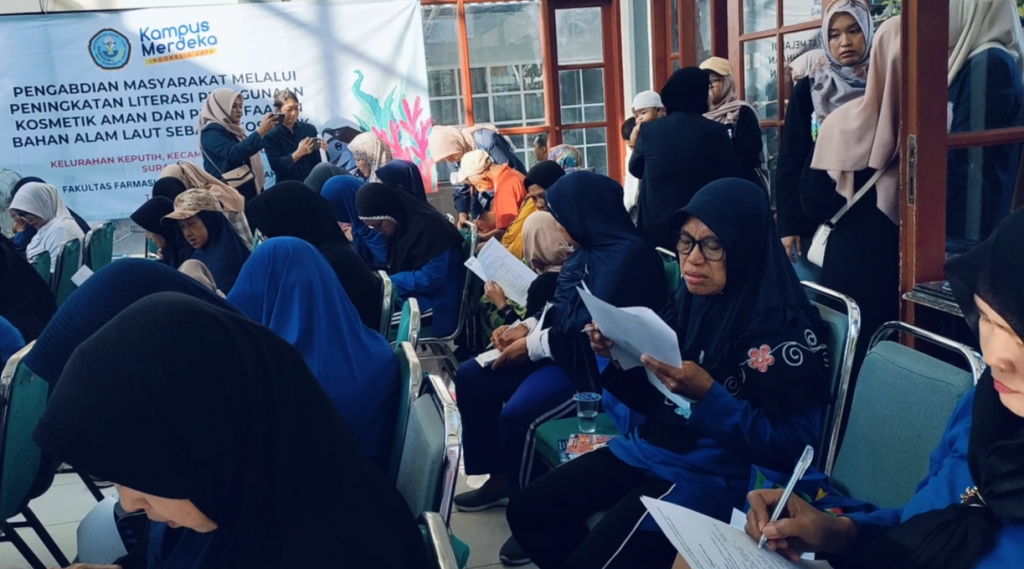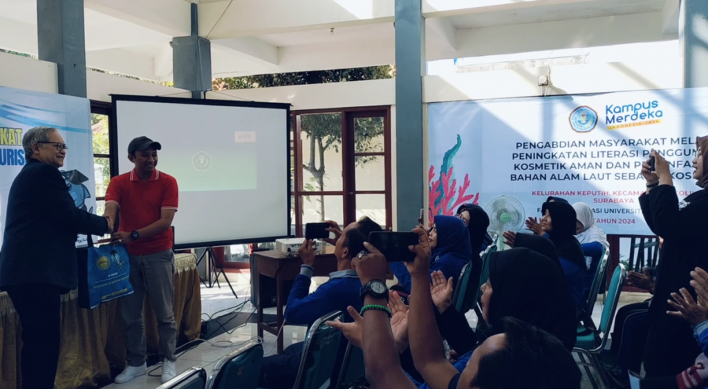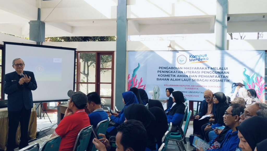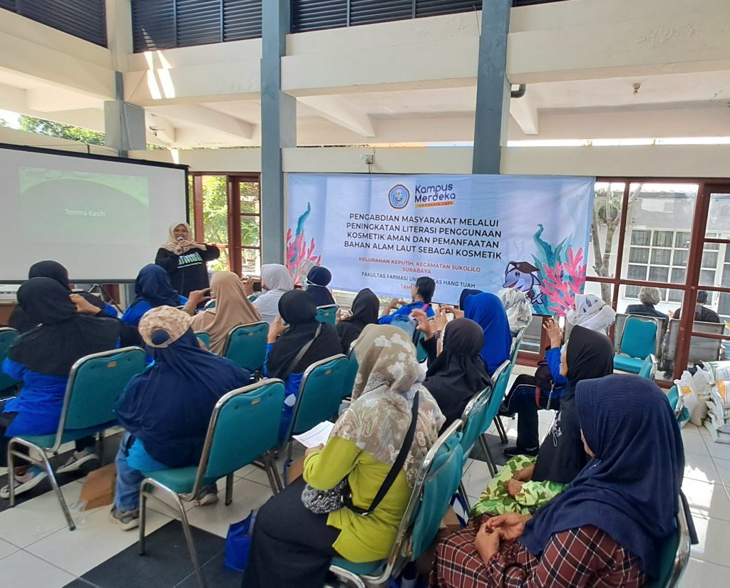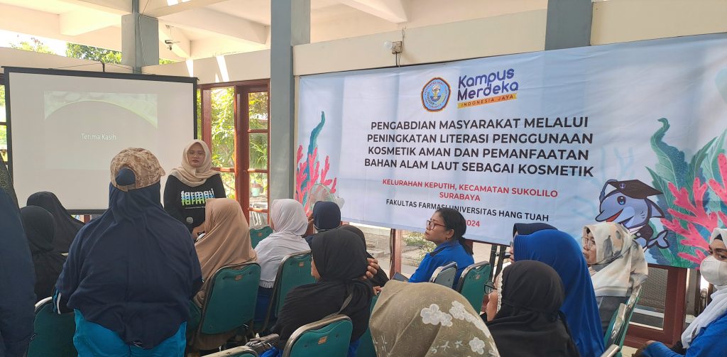 Sabtu 03 Agustus 2024 Bagian Farmasetika Fakultas Farmasi Universitas Hang Tuah mengadakan pengabdian kepada masyarakat mengenai “ Peningkatan Literasi Penggunaan Kosmetik Aman dan Pemanfaatan Bahan Alam Laut sebagai Kosmetik”. Kegiatan ini dilaksanakan di Kelurahan Keputih, Kecamatan Sukolilo, Kota Surabaya, yang dihadiri oleh masyarakat lansia Kelurahan Keputih. Kegiatan dihadiri langsung oleh Dekan Fakultas Farmasi Hang Tuah Bapak Prof. Dr. apt. Suko Harjono, M.S., Kepala Desa Kelurahan Keputih Surabaya Bapak A.F Fajar Febriansyah., S.H., Ketua Pengmas Ibu apt. Yuyun Nailufa., S.Farm. M. Farm., beserta Bapak Ibu Dosen Fakultas Farmasi Universitas Hang Tuah. Kegiatan pengabdian masyaakat ini juga melibatkan mahasiswa Fakultas Farmasi Universitas Hang Tuah.
