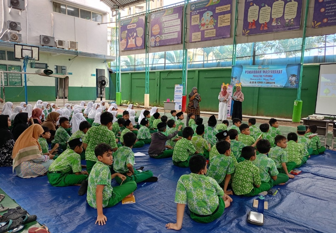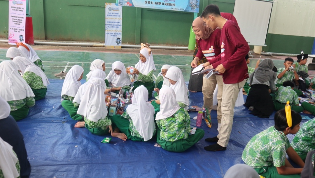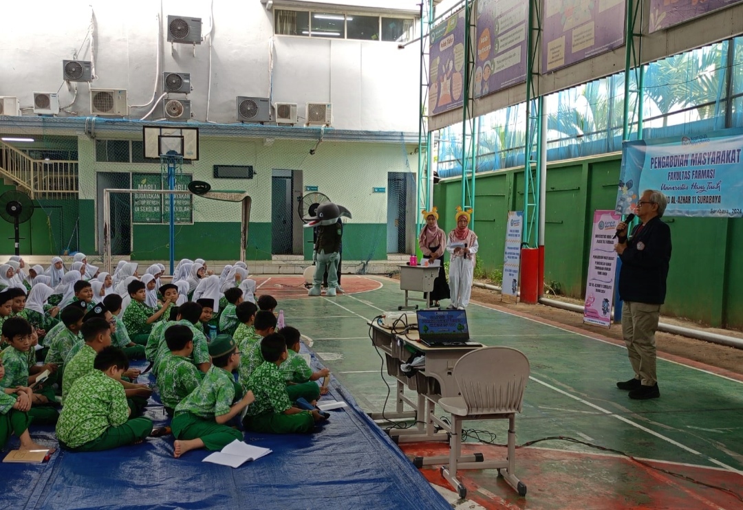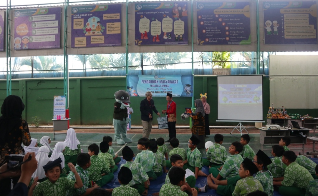 Sabtu, 26 Oktober 2024, menjadi hari yang penuh semangat di SD Islam Al-Azhar 11 Surabaya. Kegiatan pengabdian kepada masyarakat yang diselenggarakan oleh sivitas akademika Universitas Hang Tuah ini melibatkan Dekan Fakultas Farmasi, dosen farmasi, tenaga kependidikan farmasi, mahasiswa farmmasi, guru, serta 110 siswa dari kelas 3 hingga kelas 6. Dengan tema edukasi tambahan pangan alami dan buatan serta pengenalan konsep Beyond Use Date (BUD) dalam sediaan farmasi, kegiatan ini dirancang untuk memberikan wawasan praktis dan menyenangkan kepada para siswa.Melalui pendekatan interaktif, siswa diajak memahami perbedaan tambahan pangan alami seperti pewarna dari buah naga, kunyit dan pandan, serta tambahan buatan seperti rhodamin B. Mereka juga diperkenalkan pada cara membaca informasi penting pada kemasan obat untuk memahami dosis dan penggunaan yang aman. Antusiasme semakin meningkat ketika siswa diberi kesempatan praktik langsung cara membedakan minuman dengan pewarna alami dan buatan, serta mengikuti kuis edukatif. Dengan metode ceramah ringan, alat peraga, dan video singkat, kegiatan ini tidak hanya edukatif tetapi juga memberikan pengalaman berharga yang relevan dengan kehidupan sehari-hari.